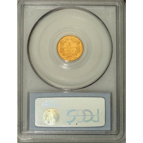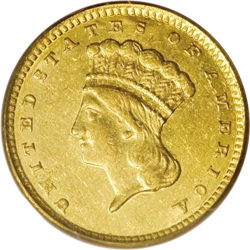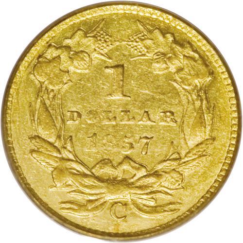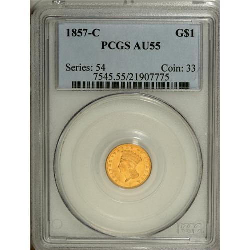 <B>1857-C G$1 AU55 PCGS.</B></I> Variety 10-L. Luster brightens the devices and legends, and the strike is crisp except for the 8 in the date and the N in UNITED. A few inconspicuous marks on the upper left obverse field are all that prevent a finer grade. Just 13,280 pieces were struck. Population: 10 in 55, 8 finer (11/06).<BR><BR><b>Shipping:</b> Coin/Currency (<a target="_blank" href="http://www.heritageauctions.com/common/shipping.php">view shipping information</a>)