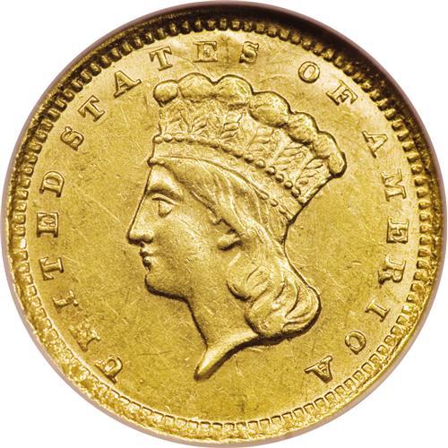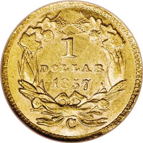 <B>1857-C G$1 AU58 NGC.</B></I> Variety 10-L. A high grade survivor of this scarce issue. Only 13,280 pieces were struck with an estimated 115-125 coins believed extant today in all grades. At the AU58 level, this is one of the finer coins known. The surfaces show the usual abrasions that are common to almost all 1857-C gold dollars. A bit weakly struck, as usual. An important coin for the gold dollar specialist or the collector of Charlotte gold.<BR><BR><b>Shipping:</b> Coins & Currency (<a target="_blank" href="http://www.heritageauctions.com/common/shipping.php">view shipping information</a>)