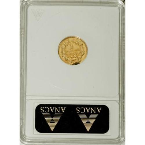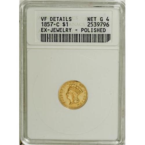<B>1857-C G$1 --Ex-Jewelry, Polished--ANACS. VF Details, Net Good 4.</B></I> NGC Census: (0/128). PCGS Population (0/137). Mintage: 13,200. Numismedia Wsl. Price for NGC/PCGS coin in G4 : $190. (#7545)<BR><BR><B>Coin Engraver:</B> James B. Longacre<BR><BR><b>Shipping:</b> Coins & Currency (<a target="_blank" href="http://www.heritageauctions.com/common/shipping.php">view shipping information</a>)