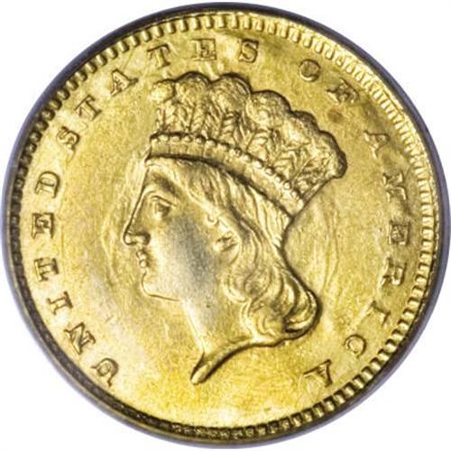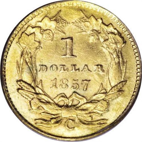 <B>1857-C G$1 MS61 PCGS.</B></I> Variety 10-L. The 1857-C gold dollar is probably best known for the overall poor quality among the surviving examples. The original mintage was only 13,280 pieces, and today it is believed that a mere 115-125 examples are that are left in all grades. This is one of the finest examples we have handled, with striking details that are far superior to what is usually seen on this challenging issue. That includes complete detailing on the middle digits of the date. The "strips" of roughness frequently found around Liberty's head are present, and they appear to be something more than die clashing. The 1857-C is extremely rare in mint condition, with only a small handful of coins known in MS60 or finer grades. Bright yellow-gold color with minimal abrasions for an MS61. <BR><BR><B>Coin Engraver:</B> James B. Longacre<BR><BR><b>Shipping:</b> Coins & Currency (<a target="_blank" href="http://www.heritageauctions.com/common/shipping.php">view shipping information</a>)