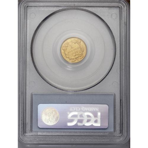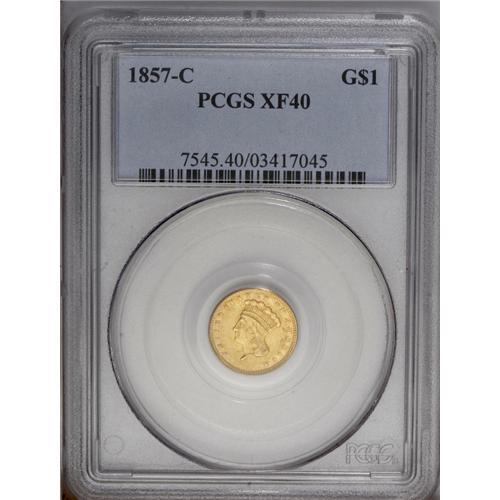 <B>1857-C G$1 XF40 PCGS.</B></I> Variety 10-L. An evenly circulated olive-gold representative with only a single noticeable mark, a wispy pinscratch above the bust tip. The 18 in the date is a bit soft, as usual for the issue, as it is opposite the comparatively high relief cheek. A couple of obverse mint-made planchet flaws are noted near 3 o'clock. A low emission of 13,280 pieces.<BR><I>From The Carolina Gold Collection, Part Two.</B></I>