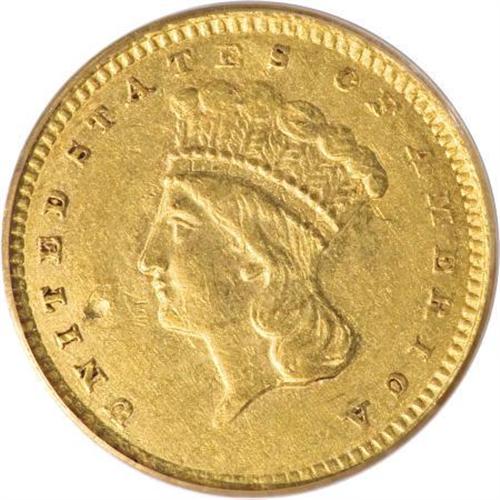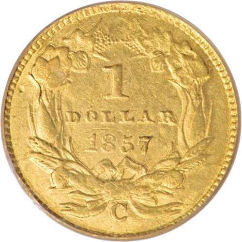 <B>1857-C G$1 XF45 PCGS.</B></I> Variety 10-L. This Charlotte gold dollar is well struck and has extensive luster for the Choice XF level. A roundish depression is noted on the left obverse field, and is accompanied by faint marks. The cheek also has a few thin abrasions. Only 13,280 pieces were struck. Population: 30 in 45, 57 finer (8/07).<BR><BR><B>Coin Engraver:</B> James B. Longacre<BR><BR><b>Shipping:</b> Coins & Currency (<a target="_blank" href="http://www.heritageauctions.com/common/shipping.php">view shipping information</a>)