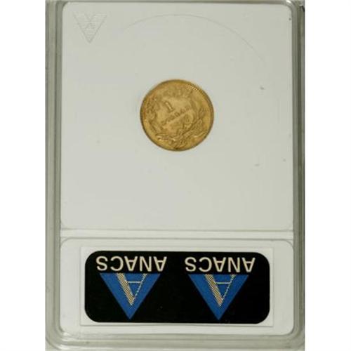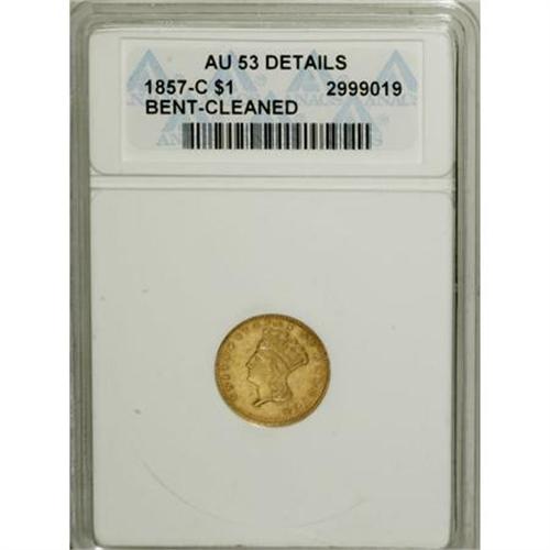 <B>1857-C G$1 --Bent, Cleaned--ANACS. AU53 Details.</B></I> Variety 8-I. Mildly wavy near the second S in STATES, and slightly glossy from a careful cleaning. Another difficult low mintage Charlotte issue. Struck from clashed dies.<BR><I>From The Pearl E. Pemberton Collection.</B></I><BR><BR><B>Coin Engraver:</B> James B. Longacre<BR><BR><b>Shipping:</b> Coins & Currency (<a target="_blank" href="http://www.heritageauctions.com/common/shipping.php">view shipping information</a>)