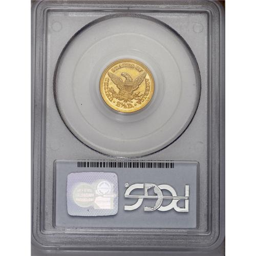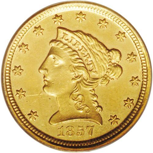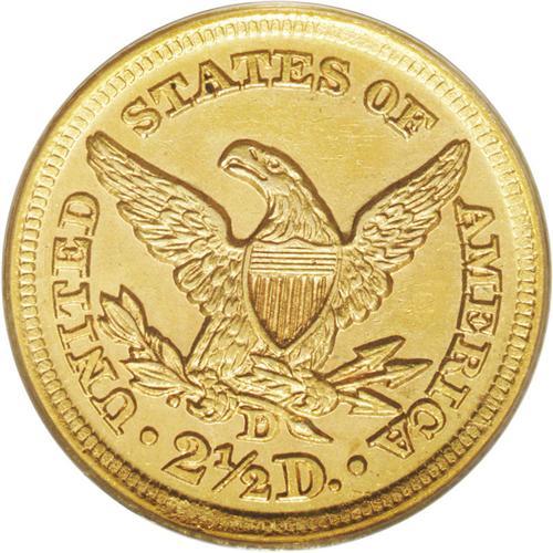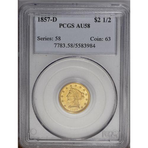<B>1857-D $2 1/2 AU58 PCGS.</B></I> Variety 20-M. An extremely impressive example of this rare Dahlonega quarter eagle, one that initially appears to be Uncirculated. The strike is bold, as usually found on this issue, save for a hint of softness on the eagle's neck. That area, the upper wingtips, and the hair below the coronet show slight wear. The luster is intense, with some cameo effect against the devices, and the color is an attractive green-gold. A few stray ticks and abrasions are consistent with a coin that saw light circulation before some farsighted early numismatist plucked it out of circulation. Population: 20 in 58, 14 finer (1/06).