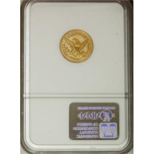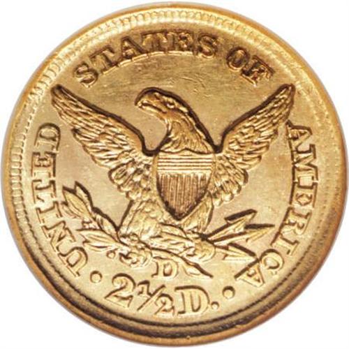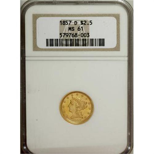 <B>1857-D $2 1/2 MS61 NGC.</B></I> Variety 20-M, the only known dies. A thin die line connects the right tip of the digit 5 to the bust truncation, a diagnostic of this obverse die. The reverse has a large D mintmark centered above the tip of the fraction bar, and joined to the branch stem. The 1857-D is a low-mintage issue (2,364 pieces) that is rare in Mint State grades. <BR> The MS61 example in this lot has sharp design features on both sides with frosty luster and attractive lemon-gold color. Some light handling marks are noted under magnification. Mint State examples of this date are seldom encountered, with estimates suggesting that only 8 to 10 examples survive today (Douglas Winter, 2003).<BR><BR><B>Coin Engraver:</B> Christian Gobrecht<BR><BR><b>Shipping:</b> Coins & Currency (<a target="_blank" href="http://www.heritageauctions.com/common/shipping.php">view shipping information</a>\)