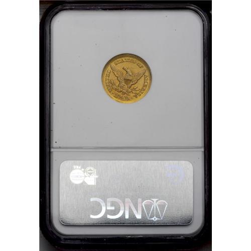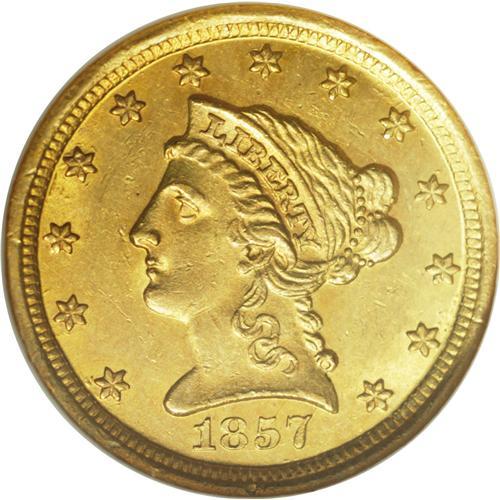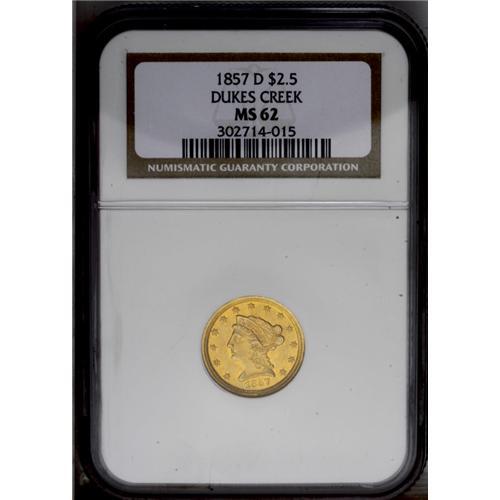 <B>1857-D<$2 1/2> MS62 NGC.</B></I> Variety 20-M. Late die state with a number of cracks through the date and the surrounding stars.<BR> Struck in rich orange gold and well struck, as is usually the case for this date, with a sharply defined central obverse; the reverse has some minor weakness on the eagle's legs and claws. Both sides show rich grainy luster and are lightly marked. A small vertical nick in front of the tip of Liberty's nose serves as a ready identifier.<BR> The 1857-D quarter eagle is a curious issue. It has a very low mintage of just 2,364 pieces, and it is a fairly scarce coin in terms of overall rarity, with around 110-130 pieces known. Surprisingly, a high percentage of these grade better than XF45, and this suggests that a hoard may have existed at one time. There are around a dozen or so known in Uncirculated, with most of these in the MS60 to MS61 range. NGC shows a current population of three pieces in MS62, and just one finer. The Duke's Creek specimen is among the finest known, and it is ranked #1 on the current Condition Census from 2003. At one time, the Duke's Creek Collection contained two of the finest known 1857-D quarter eagles: the present example, and a piece now owned by a Kansas collector (and in a PCGS MS63 holder) that was sold by Heritage as lot 7960 in the 1999 ANA Auction.<BR><I>Ex: Dr. Arthur Montgomery Collection; Hancock and Harwell; Auction '84 (Stack's session, 8/84), lot 1326; Hancock and Harwell; George Elliott Collection; Mid-American (5/86), lot 1869; Leon Farmer Collection; Hancock and Harwell. This was the plate coin in the first edition of Doug Winter's book</B></I> Gold Coins of the Dahlonega Mint, 1838-1861.<BR><I>From The Duke's Creek Collection of Dahlonega Gold.</B></I>