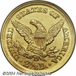 <B>1857-D<$2 1/2> MS62 PCGS.</B></I> Variety 20-M, the only known dies. Only 2,364 pieces were struck of the 1857 Dahlonega issue. Douglas Winter, in the second edition of his book <I>Gold Coins of the Dahlonega Mint,</B></I> estimates that only 110 to 130 specimens exist in all states of preservation. Of these, eight to ten are thought to be in Mint State condition. The example offered in this lot is typically well struck for the issue, with both the obverse and the reverse abounding in boldly delineated features. Some weakness is noted in the obverse dentilation from 12 to 3 o'clock, and from 2 to 8 o'clock on the reverse. Green-gold and orange-gold hues compete for dominance as the coin rotates under a light, and generous luster remains, particularly in areas around the design elements. Small, relatively unobtrusive marks are noted on Liberty's face and neck, and in the reverse field below the D mintmark. Population: 6 in 62, 6 finer (7/04). <BR><BR><B>Important notice:</B> Heritage usually auctions material at the rate of 200-250 lots per hour. On some occasions eBay Live bid software or the Internet may not be able to keep up with the pace of the auction. We recommend placing a realistic absentee bid now as insurance to avoid disappointment. Occasionally the auctioneer may eliminate or reject an eBay Live bid, and the auctioneer may also reopen a lot after the close of the eBay live bidding (usually because we missed an audience bid), and may reject your bid even if it shows you as the winning bidder. By bidding via eBay Live, you agree that Heritage may award the lot to another bidder at its sole discretion under the circumstances described above or any other reasonable circumstances. Since eBay bids are not shown to us until we open the lot on the floor, we treat those bids just like floor bids. In most cases the floor responds before the eBay bid is presented to us, due to Internet lag time, so for consistency we have made it a policy that floor bids are always considered first over tie eBay live bids. Also please note that all Heritage lots purchased through eBay Live carry a 20% Buyer's Premium. Please make sure you read the Terms and Conditions before you bid. </span></font></tr></table></td></tr></table>