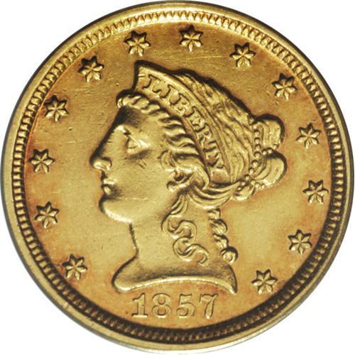 <B>1857-D $2 1/2 XF40 PCGS.</B></I> Variety 20-M. A tiny mintage of 2,364 pieces in this antebellum year tells the story of this issue. It is quite elusive in all grades, although Garrett-Guth point out that examples of this denomination and year--unlike 1857-D gold dollars--are well struck. This piece offers the expected sharpness with light circulation wear, on surfaces that are green-gold with orange-gold in the protected areas around the devices.<BR><BR><b>Shipping:</b> Coins & Currency (<a target="_blank" href="http://www.heritageauctions.com/common/shipping.php">view shipping information</a>)