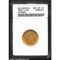 1857-D $5--Cleaned--ANACS.<p>AU Details, Net XF40. The surfaces are slightly dull resulting from the obvious cleaning. Still, a pronounced green-gold appearance remains over each side. An affordable example of this scarce D-mint issue. Important notice: We expect to be auctioning lots at the rate of 200-250 per hour. Sometimes eBay Premier live bid software cannot keep up with that pace, so we strongly recommend that you place a realistic proxy bid now as insurance to avoid disappointment. Also please note that all Heritage/CAA lots purchased through eBay Premier carry a 20% Buyer's Premium.