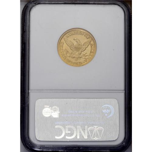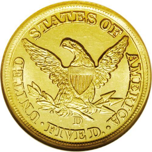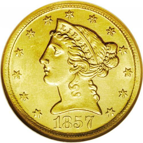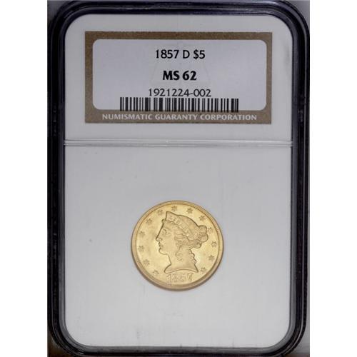 <B>1857-D $5 MS62 NGC.</B></I> Variety 34-CC. The production of Dahlonega half eagles retreated to just 17,046 pieces in 1857, the lowest mintage figure for any D-mint five during its first 20 years of operation. There are predictably few Mint State survivors, among which this well struck example certainly ranks among the nicest. As already mentioned, the strike is boldly executed for an 1857-D and an attractive reddish tint is seen over minimally abraded surfaces. Look for a strong bid to be required to secure this lovely Uncirculated Southern gold coin. Census: 4 in 62, 2 finer (1/06).