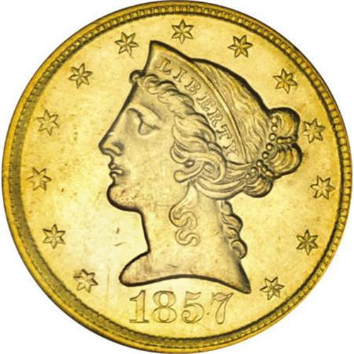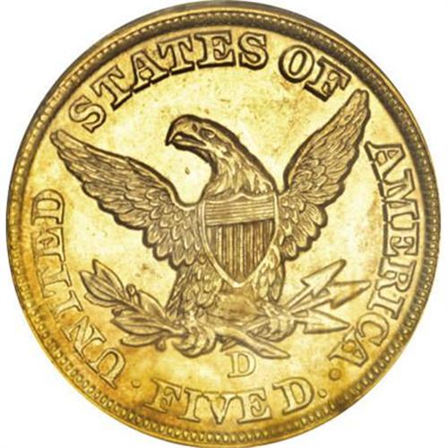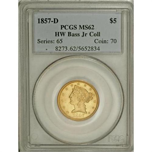 <B>1857-D $5 MS62 PCGS.</B></I> Ex: Bass. Variety 28-V. Formerly offered as lot 473 in the Bass III sale, where it was described in part as, "This is an extremely rare coin and is among the very finest known. Extremely sharp strike with frosty, brilliant yellow gold luster. Only occasional surface marks are noted, as expected. With a high degree of aesthetic appeal, which is quite unusual. Doug Winter noted: 'The majority of 1857-D half eagles do not have especially good eye appeal. This is the result of poor strikes, inferior planchets and numismatic abuse. Any example with good eye appeal is quite rare.' This example, which may qualify as second finest known is equal in quality to the plate coin in the Winter reference. However, the present piece is much more sharply struck.<BR> "Date logotype fairly shallow in the die--more resembling a typical Philadelphia Mint half eagle than one from Dahlonega."<BR> Since those words were written in 2000, the population data have changed little. Both NGC and PCGS each show three pieces certified in MS62, with two finer, which could in reality represent only a small handful of individual coins (12/07).<BR><I>Purchased from Joe Flynn, March 17, 1978; Bass III (Bowers and Merena, 5/00), lot 473; The Ashland City Collection (Heritage, 5/2003), lot 4798.</B></I><BR><BR><B>Coin Engraver:</B> Christian Gobrecht<BR><BR><b>Shipping:</b> Coins & Currency (<a target="_blank" href="http://www.heritageauctions.com/common/shipping.php">view shipping information</a>)