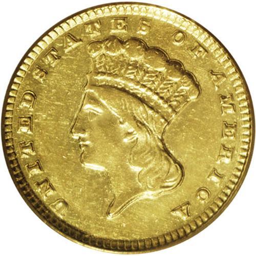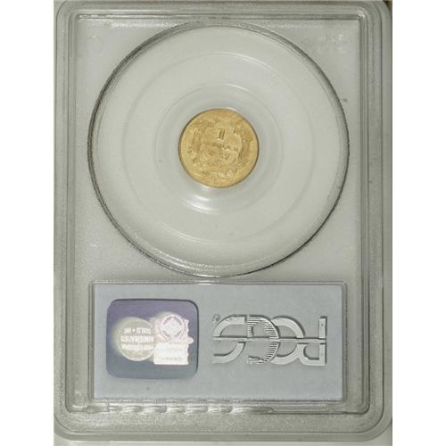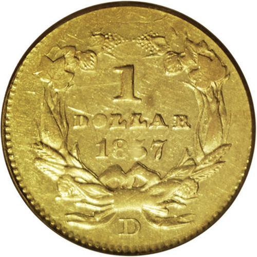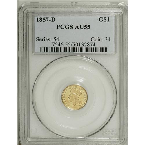 <B>1857-D G$1 AU55 PCGS.</B></I> Variety 9-L, the only variety for the year. Lustrous light yellow-gold surfaces with a hint of green color. Both sides have highpoint weakness, typical of this issue. Faint hairlines and other scattered imperfections are present on both sides, as usual for this issue and for all Southern Mint gold coinage. This is an important opportunity for the collector to acquire a pleasing example of this low mintage issue.<BR><I>From The Frank J. McCarthy Jr. Collection.</B></I><BR><BR><b>Shipping:</b> Coins & Currency (<a target="_blank" href="http://www.heritageauctions.com/common/shipping.php">view shipping information</a>)