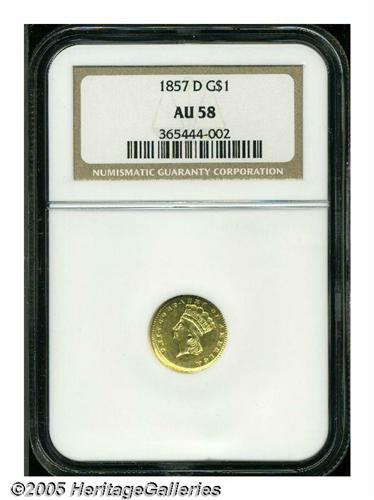 <B>1857-D<G$1> AU58 NGC.</B></I> Variety 9-L. Substantial mint flash is evident despite light friction on the hair and wreath. Devoid of unpleasant marks, and the strike and planchet are pleasant. A low mintage of 3,533 pieces secures the rarity of this challenging, somewhat underrated Dahlonega issue in near-Mint condition. Population: 24 in 58, 11 finer (3/05).