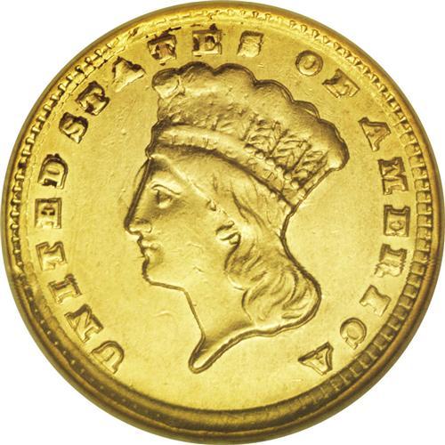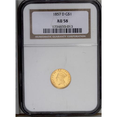 <B>1857-D<G$1> AU58 NGC.</B></I> Variety 9-L. This smooth and dirt-free Borderline Uncirculated example displays prominent clash marks about the major devices, but is surprisingly void of abrasions. Bluntly struck on the wreath bow and on the top of the headdress. A mere 3,533 pieces were produced. Census: 25 in 58, 12 finer (7/06).