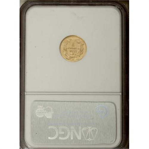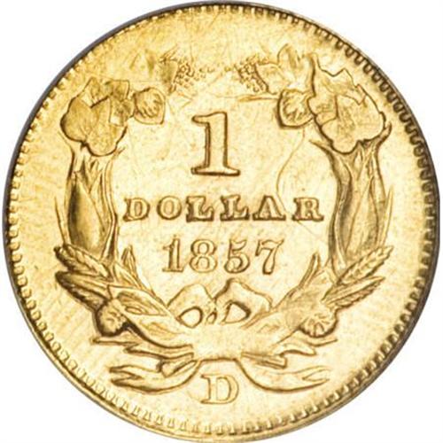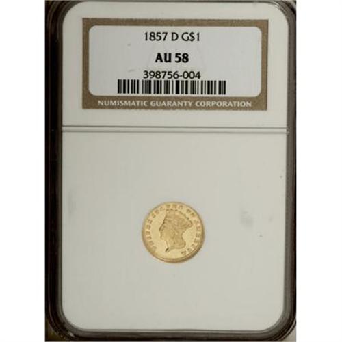 <B>1857-D G$1 AU58 NGC.</B></I> Variety 9-L. A pleasing coin at first glance, appearing unworn and with light cameo contrast. Under a loupe, only light rub is noted, and the surfaces are pleasing for this issue. According to Doug Winter's <I>Gold Coins of the Dahlonega Mint: 1838-1861,</B></I> the 1857-D is much rarer than the 1858-D or 1859-D gold dollars, even though comparably valued. This issue is frequently found poorly struck. The strike on the present example is weak on both the headdress and the hair, but the color is a delightful green-gold, and there are no major scrapes or abrasions. The obverse shows numerous hairlines and field chatter under a glass, but the cheek of Liberty is surprisingly clean. Both dies are heavily clashed, and the reverse shows parallel raised segments on both sides, in this case heaviest outside the wreath, that are characteristic of this issue. The date, denomination, and mintmark are all bold, with a pleasing amount of wreath detail. In spite of the numerous condition qualifiers on this coin, it retains a considerable amount of that most elusive of criteria, eye appeal. Census: 28 in 58, 12 finer (12/07).<BR><BR><B>Coin Engraver:</B> James B. Longacre<BR><BR><b>Shipping:</b> Coins & Currency (<a target="_blank" href="http://www.heritageauctions.com/common/shipping.php">view shipping information</a>)