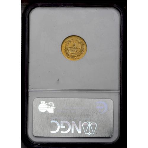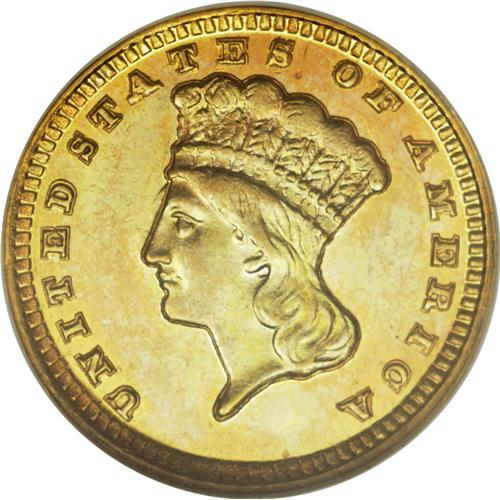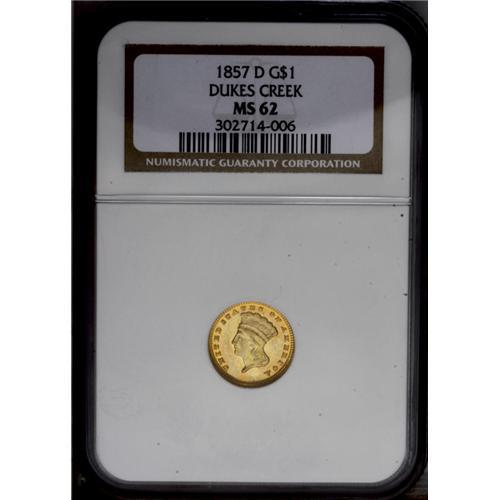 <B>1857-D<G$1> MS62 NGC.</B></I> Variety 9-L.The reverse used for this issue is likely the same as that found on the 1856-D gold dollar. It has a filled O in DOLLAR as well as raised segments on the reverse from 2 to 5 o'clock, as struck.<BR> This piece shows an average strike for the issue, with some weakness on the hair of Liberty. Approximately half of the hair shows individual definition, mostly on the curls around the face; the top of the head is sharper than usual. The date is nearly full, with minor weakness on the tops of 85.<BR> Most 1857-D gold dollars are abraded and have below-average surfaces. This piece is quite clean, with just a few scattered marks and hairlines in the fields. The center of the reverse has a few ticks, none of which are deep or worthy of individual mention. A small reverse planchet chip at the top of the right side of the wreath is Mint-made and clearly identifies this example. As mentioned above, what looks like small scratches on the reverse border are, in fact, Mint-made die scratches that are diagnostic to the issue. The luster on this piece is far above average for the issue. Both the obverse and reverse are frosty, making this coin unusual, as many 1857-D gold dollars are dull and appear lifeless. Splashes of reddish-gold coloration are most prevalent around the edge of the obverse; the reverse has lighter and slightly more even color.<BR> The 1857-D has a mintage of 3,533 pieces, and an estimated 120-130 are known today. This is a very rare coin in Uncirculated, with no more than five to seven properly graded examples known. The Duke's Creek coin has long been regarded as the finest known and is accompanied by a wonderful pedigree.<BR><I>Ex: Rawson Collection (BMM, 11/22); John Clapp Sr.; John Clapp Jr; Eliasberg Collection (Bowers and Ruddy, 10/82), lot 36; Hancock and Harwell; Georgia Collection; Leon Farmer Collection; Hancock and Harwell. This is the plate coin in the first edition of Doug Winter's book</B></I> Gold Coins of the Dahlonega Mint, 1838-1861.<BR><I>From The Duke's Creek Collection of Dahlonega Gold.</B></I>