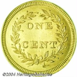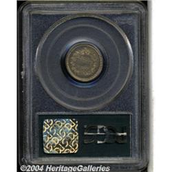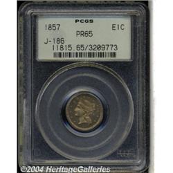 <B>1857<E1C> One Cent, Judd-186, Pollock-222, High R.7, PR65 PCGS.</B></I> Liberty Head facing left, wearing a coronet, the reverse with ONE / CENT encircled by a wreath. Struck in copper-nickel with a plain edge. The obverse die was also used to produced a quarter eagle pattern, J-189. The reverse die was earlier used on an 1853 pattern cent. The Coinage Act of February 12, 1857 discontinued the half cent denomination and ended the series of large cents as well. Although a number of copper-nickel one cent coins were issued on an experimental basis during the previous year, it was not until this Act was passed that the nation had an official small cent issue. During this period, the Mint experimented with a number of different designs and compositions, including this particular pattern rarity. Attractive golden-brown surfaces with satiny fields exhibiting numerous striations. Not deeply mirrored but undoubtedly struck in proof format. This is an exceptionally attractive example despite a few minor spots and other imperfections. <BR><BR><B>Important notice:</B> Heritage usually auctions material at the rate of 200-250 lots per hour. On some occasions eBay Live bid software or the Internet may not be able to keep up with the pace of the auction. We recommend placing a realistic absentee bid now as insurance to avoid disappointment. Occasionally the auctioneer may eliminate or reject an eBay Live bid, and the auctioneer may also reopen a lot after the close of the eBay live bidding (usually because we missed an audience bid), and may reject your bid even if it shows you as the winning bidder. By bidding via eBay Live, you agree that Heritage may award the lot to another bidder at its sole discretion under the circumstances described above or any other reasonable circumstances. Since eBay bids are not shown to us until we open the lot on the floor, we treat those bids just like floor bids. In most cases the floor responds before the eBay bid is presented to us, due to Internet lag time, so for consistency we have made it a policy that floor bids are always considered first over tie eBay live bids. Also please note that all Heritage lots purchased through eBay Live carry a 20% Buyer's Premium. Please make sure you read the Terms and Conditions before you bid. </span></font></tr></table></td></tr></table>