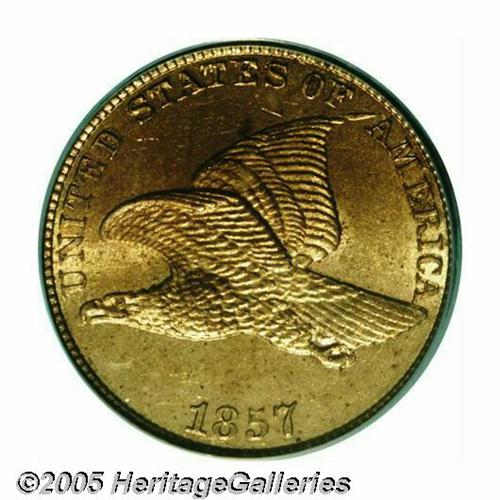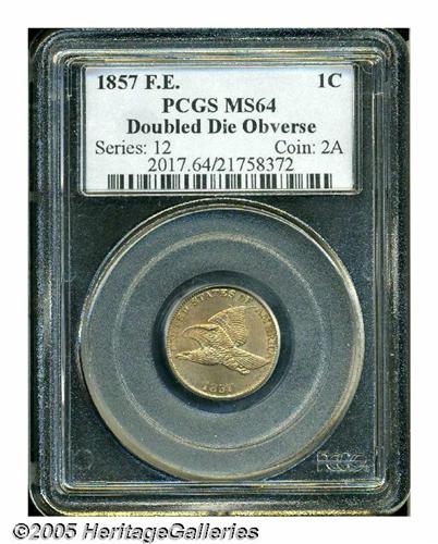 <B>1857 Flying Eagle<1C> Doubled Die Obverse MS64 PCGS.</B></I> Snow-3, FS-002. Obvious doubling is visible on most of the letters of the legend and on the eagle's eye and beak. This example has a pleasant reddish-tan color and complimented with a sharp strike. A few small marks and freckles of carbon are visible that limit the grade. A great coin for the variety specialist.
