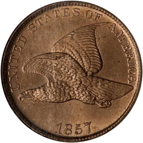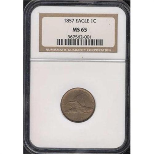 <b>1857 Flying Eagle Cent. NGC graded MS65.</b> A worldly measure of pouring tan cartwheel luster livens up the wide expanse of surface area on this gem flying eagle cent. The fields are for all intents and purposes pristine, and the strike is intrepid enough to call for special mention. Wingtip, head, tail: the three problem areas on the obverse side of many flying eagles. These design components rarely strike with good detail. As the photographs show, and as a magnifying glass confirms, and as the NGC grade attests, this coin, unlike so many others, is indeed bold in all three key areas mentioned <b>(PCGS # 2016)</b>
