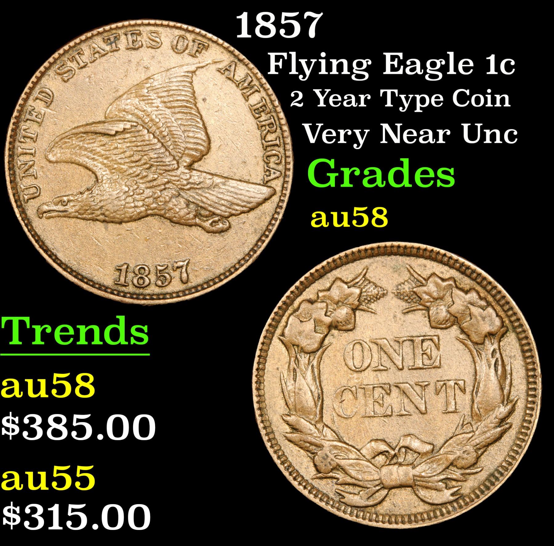 1857 2 Year Type Coin Very Near Unc Flying Eagle Cent 1c Grades Choice AU/BU Slider. A Corey's Pick, Bid to Win, Don't let it get Away Coin