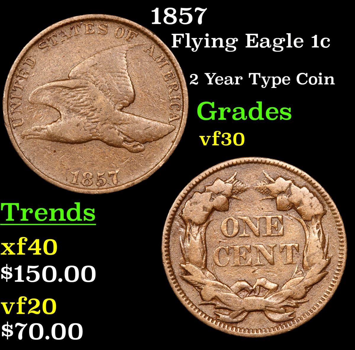 1857 2 Year Type Coin . Flying Eagle Cent 1c Grades vf++.