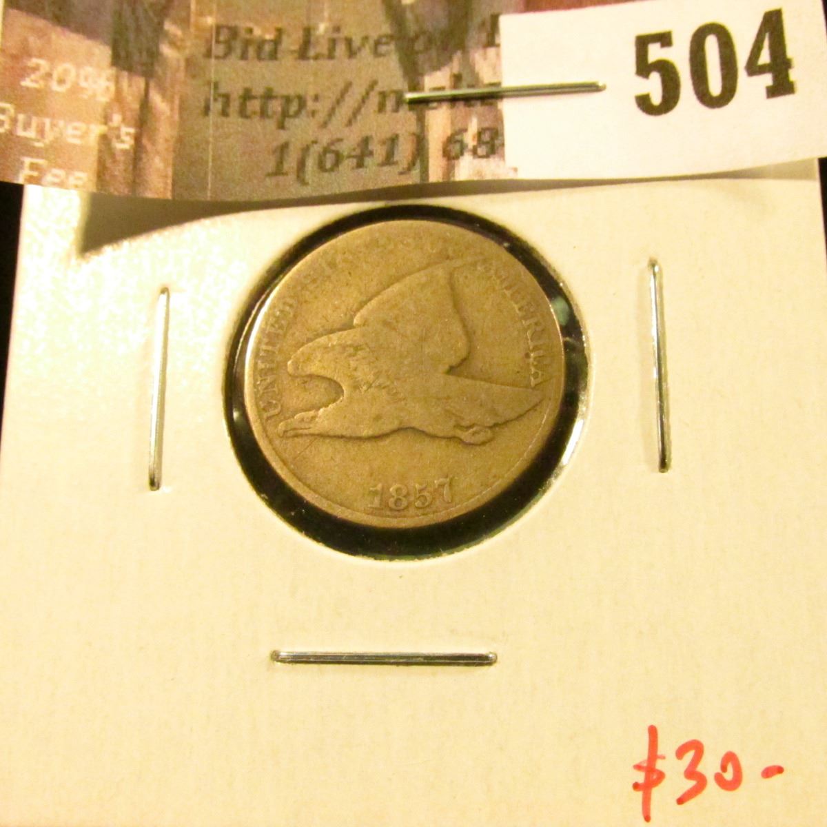 1857 Flying Eagle Cent, G, value $30