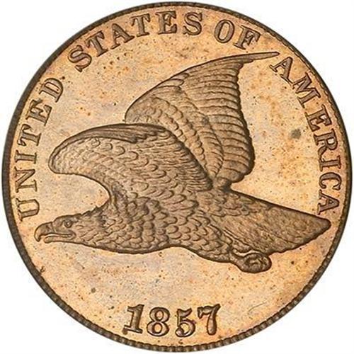 This is the flying eagle cent from an amazing 1857 set of Proof coins, a coin whose powerfully burning mirrors swirl like a fire storm on the satiny frosted, largely brilliant surfaces of this near-perfect Proof 64 specimen. A flicker of light gold highlights the uppermost feathers of the eagle's likeness, with comparable splashes on the wreath on the reverse. Very rare in Proof condition!