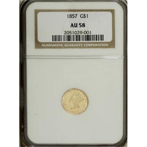 1857 G$1 AU58 NGC. NGC Census: (132/559). PCGS Pop