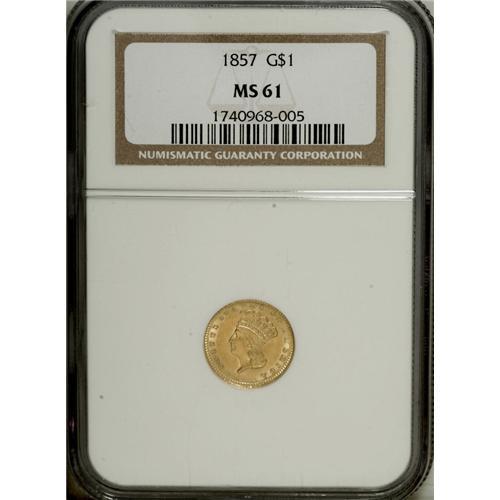 1857 G$1 MS61 NGC. NGC Census: (209/318). PCGS Populat
