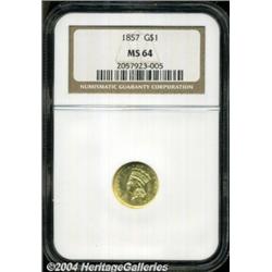 <table><tr><td><table><tr><td>1857 G$1 MS64 NGC. Flashy lustrous surfaces that are free from bothersome marks. A few areas of strike weakness are noted that limit the grade. <BR><BR><B>Important notice:</B> Heritage usually auctions material at the rate of 200-250 lots per hour. On some occasions eBay Live bid software or the Internet may not be able to keep up with the pace of the auction. We recommend placing a realistic absentee bid now as insurance to avoid disappointment. Occasionally the auctioneer may eliminate or reject an eBay Live bid, and the auctioneer may also reopen a lot after the close of the eBay live bidding (usually because we missed an audience bid), and may reject your bid even if it shows you as the winning bidder. By bidding via eBay Live, you agree that Heritage may award the lot to another bidder at its sole discretion under the circumstances described above or any other reasonable circumstances. Since eBay bids are not shown to us until we open the lot on the floor, we treat those bids just like floor bids. In most cases the floor responds before the eBay bid is presented to us, due to Internet lag time, so for consistency we have made it a policy that floor bids are always considered first over tie eBay live bids. Also please note that all Heritage lots purchased through eBay Live carry a 20% Buyer's Premium. Please make sure you read the Terms and Conditions before you bid. <BR><BR><B>IMPORTANT ANNOUNCEMENT ABOUT RESERVES:</B> Heritage now divulges all reserves on its web site 7 days before every auction. If you want to know whether the reserve on this lot has been met, and if not, what the reserve amount is, please visit this lot page on the HeritageCoin.com web site, or email: bid@HeritageGalleries.com </span></font></td></tr></table></td></tr></table>