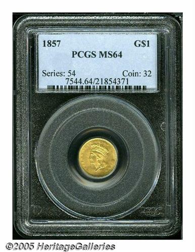 1857 G$1 MS64 PCGS. Typically struck, from mildly