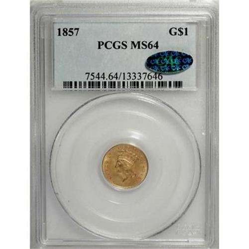 <B>1857 G$1 MS64 PCGS. CAC.</B></I> A strongly lustrous example of this higher-mintage Type Three gold dollar issue, well-defined with excellent eye appeal. The yellow-gold fields are particularly well-preserved. Population: 37 in 64, 24 finer (11/07).<BR><BR><B>Coin Engraver:</B> James B. Longacre<BR><BR><b>Shipping:</b> Coins & Currency (<a target="_blank" href="http://www.heritageauctions.com/common/shipping.php">view shipping information</a>)