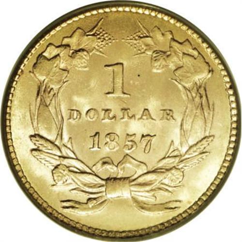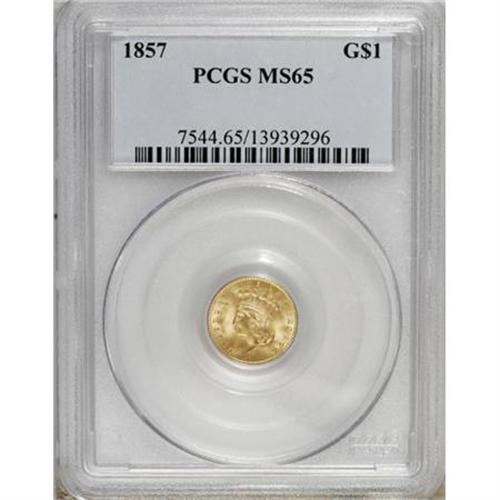 <B>1857 G$1 MS65 PCGS.</B></I> The 1857 gold dollar, from a generous mintage of nearly 800,000 pieces, is common through the lower grades of Mint State, but rare in Gem quality. Both sides of this MS65 are awash in glowing luster, and possess wheat-gold color. The design features are uniformly well struck. Nicely preserved throughout. Population: 10 in 65, 14 finer (10/07).<BR><BR><B>Coin Engraver:</B> James B. Longacre<BR><BR><b>Shipping:</b> Coins & Currency (<a target="_blank" href="http://www.heritageauctions.com/common/shipping.php">view shipping information</a>)
