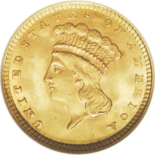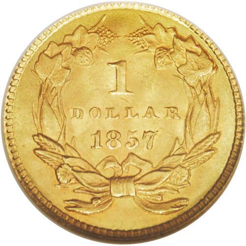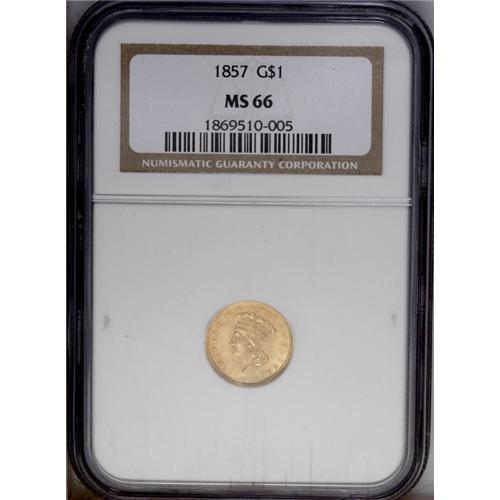 1857 G$1 MS66 NGC. Deep, satiny surfaces present an ev