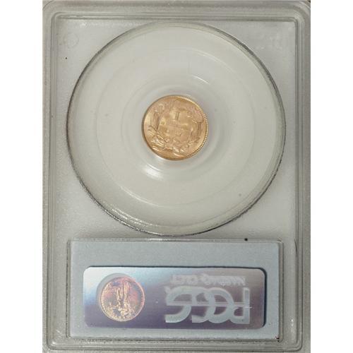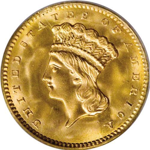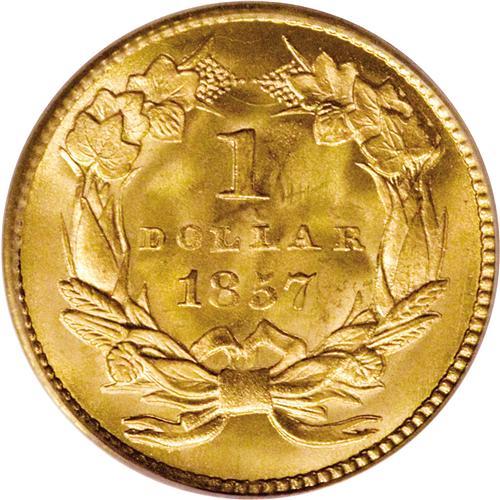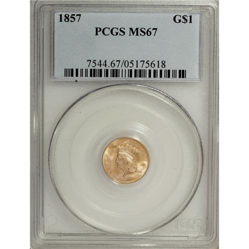<B>1857 G$1 MS67 PCGS.</B></I> While even Superb Gem Type Three dollars from late in the Indian Head series (1874-1889) are found with some frequency, the 1857 gold dollar in Superb Gem or finer is another matter entirely. Numismatists, as well as the collecting public who occasionally laid aside a nice coin, likely knew from the mid-1870s onward that the series was eventually doomed. The signs were clear: The last sizeable mintage occurred in 1874, with most of the subsequent emissions on the far side of minuscule; the coins did not circulate but were popular as souvenirs; and the Morgan dollar mintage started in 1878, obviating the need for a duplicate gold denomination.<BR> While most of the business strikes from the late 1870s onward have MS67 populations at PCGS numbering in the dozens to low hundreds, the 1857 shows a population in Superb Gem of four pieces, with a single coin finer (4/07).<BR> This piece boasts lustrous, mark-free peach-gold surfaces with radiant brilliance. Some old clash marks are faintly visible in the obverse fields; a more-recent clash from Liberty's bust truncation on the reverse connects the wreath tops. Some light central softness is confined chiefly to the O in ONE and the 85 in the date. The reverse is rotated clockwise about 10 degrees.<BR><BR><b>Shipping:</b> Coins & Currency (<a target="_blank" href="http://www.heritageauctions.com/common/shipping.php">view shipping information</a>)