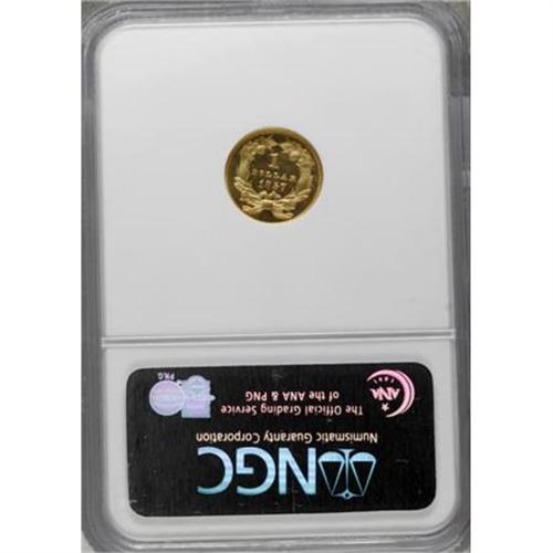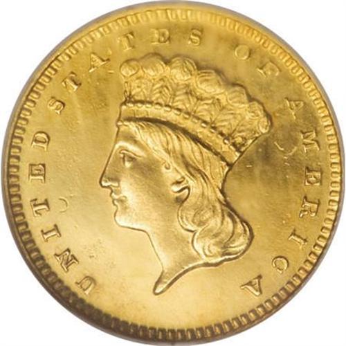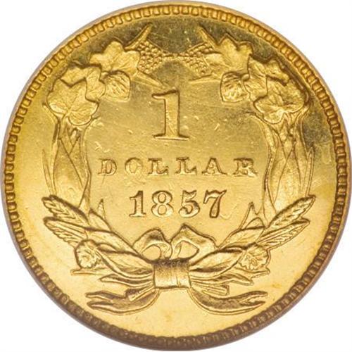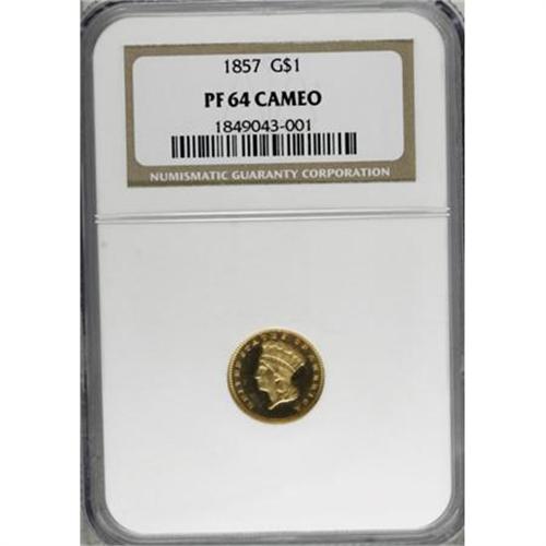 <B>1857 G$1 PR64 Cameo NGC.</B></I> Akers' gold dollar reference estimates that only eight to 10 proof 1857 gold dollars are known today, hailing as they do from a vintage the year before the Mint began widely offering proof coins to the collecting public. Given the total certified population at NGC and PCGS of 11 pieces and accounting for resubmissions, that estimate appears near to the mark today. The present example shows the sharp detail characteristic of proofs, as well as the low date that slants up slightly toward the right. The orange-gold surfaces are well mirrored, providing considerable contrast against frosty devices. A curving lintmark in the left obverse field provides a pedigree marker, and some faint slide marks on the cheek preclude a Gem grade. This coin nevertheless offers broad appeal, both numismatically and aesthetically. Census: 2 in 64 Cameo, 3 finer (7/07).<BR><BR><b>Shipping:</b> Coins & Currency (<a target="_blank" href="http://www.heritageauctions.com/common/shipping.php">view shipping information</a>\)