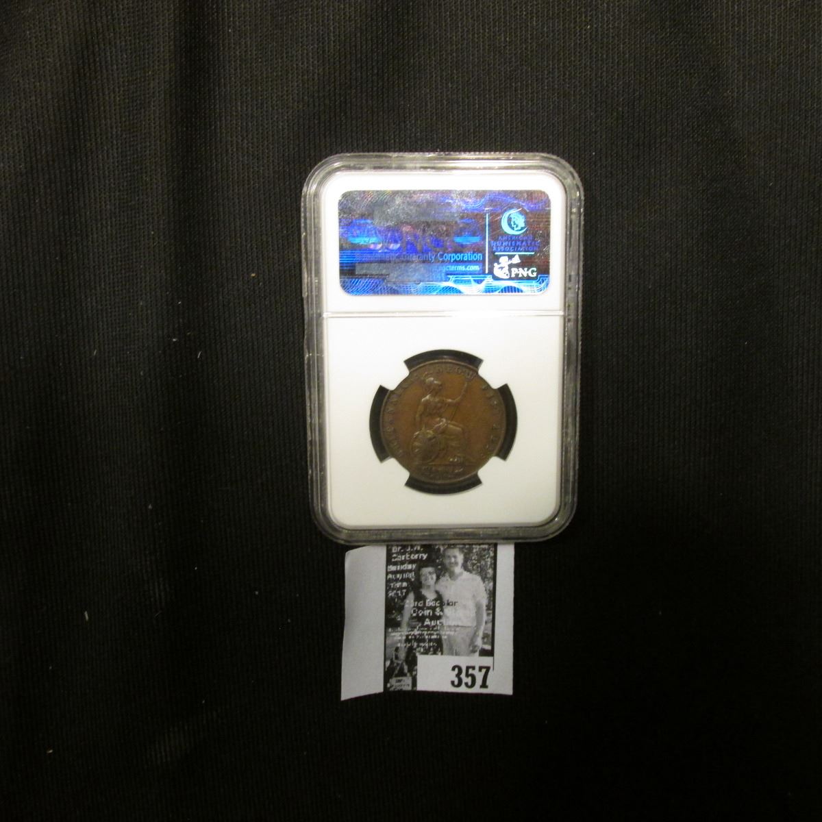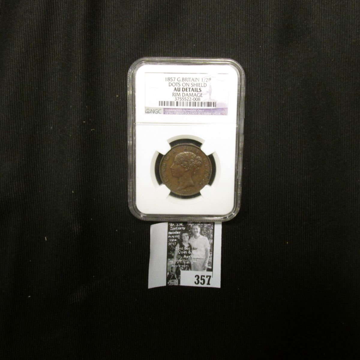 1857 Great Britain Half Penny NGC slabbed Dots on Shield AU Details Rim Damage.