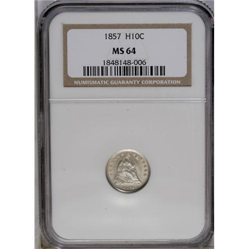 <B>1857<H10C> MS64 NGC.</B></I> Silver-gray surfaces display frosty luster and barely discernible light tan undertones. The design elements are generally adequately brought up, though Liberty's hair and the stars along the right border are soft. A faint pinscratch is noted in the upper right obverse quadrant, and another in the lower left.