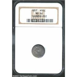 <TR><TD width="100%"><TABLE cellSpacing=1 cellPadding=3 width="100%" border=0><TBODY><TR><TD width="100%" bgColor=#79735c><FONT face=arial color=#ffffff size=3><B>Description</B> </FONT></TD></TR><TR><TD width="100%" bgColor=#ffffff><FONT face=arial size=2><B>1857 H10C MS64 NGC.</B></I> Rich, satiny surfaces are colored in pink and gray shades. The strike is a trifle soft, but the surfaces are extremely clean.<BR><I>From the Brian Loncar Collection.</B></I> </FONT></TD></TR></TBODY></TABLE></TD></TR></TBODY></TABLE><BR><A name=PricesRealized></A><TABLE cellSpacing=0 cellPadding=0 width="100%" bgColor=#000000 border=0><TBODY><TR><TD width="100%"><TABLE cellSpacing=1 cellPadding=3 width="100%" border=0><TBODY><TR><TD width="100%" bgColor=#79735c><A name=PR><FONT face=arial color=#ffffff size=3><B>Previous Prices from Heritage Auctions</B> </FONT></A></TD></TR><TR><TD bgColor=#f6f6ed><TABLE cellSpacing=0 cellPadding=0 width="100%" border=1><TBODY><TR><TD align=middle width="33%"><B>Date</B></TD><TD align=middle width="33%"><B>Service</B></TD><TD align=middle width="33%"><B>Price</B></TD></TR><TR bgColor=whitesmoke><TD width="33%"><B>12/03/2002</B></TD><TD width="33%">NGC</TD><TD width="33%">$391.00</TD></TR><TR bgColor=whitesmoke><TD width="33%"><B>10/06/2000</B></TD><TD width="33%">NGC</TD><TD width="33%">$603.75</TD></TR><TR bgColor=whitesmoke><TD width="33%"><B>10/01/1993</B></TD><TD width="33%">NGC</TD><TD width="33%">$412.50</TD></TR><TR bgColor=whitesmoke><TD width="33%"><B>09/18/1996</B></TD><TD width="33%">NGC</TD><TD width="33%">$264.00</TD></TR><TR bgColor=whitesmoke><TD width="33%"><B>09/09/1994</B></TD><TD width="33%">NGC</TD><TD width="33%">$220.00</TD></TR><TR bgColor=whitesmoke><TD width="33%"><B>08/07/2000</B></TD><TD width="33%">ANACS</TD><TD width="33%">$310.50</TD></TR><TR bgColor=whitesmoke><TD width="33%"><B>12/24/2002</B></TD><TD width="33%">PCGS</TD><TD width="33%">$425.50</TD></TR><TR bgColor=whitesmoke><TD width="33%"><B>02/16/2000</B></TD><TD width="33%">PCGS</TD><TD width="33%">$673.00</TD></TR><TR bgColor=whitesmoke><TD width="33%"><B>08/07/2000</B></TD><TD width="33%">PCGS</TD><TD width="33%">$517.50</TD></TR><TR bgColor=whitesmoke><TD width="33%"><B>07/26/1994</B></TD><TD width="33%">PCGS</TD><TD width="33%">$605.00</TD></TR><TR bgColor=whitesmoke><TD width="33%"><B>04/11/1997</B></TD><TD width="33%">PCGS</TD><TD width="33%">$385.00</TD></TR><TR bgColor=whitesmoke><TD width="33%"><B>10/08/1994</B></TD><TD width="33%">ANACS</TD><TD width="33%">$231.00</TD></TR></TBODY></TABLE></TD></TR><TR><TD bgColor=#ffffff><FONT face=arial size=1 ?>PLEASE NOTE: All prices realized reflect the final hammer price PLUS the buyer's premium in auctions that charge a buyer's premium. Each item has a notation at the top of the listing indicating whether that lot included a buyer's premium. Example: A item that sells with a final hammer price of $100 and a 20% buyer's premium will display with a price realized of $120. All information listed is intended to be as accurate as possible, but errors are possible. Please use this guide carefully and inform us of any inaccuracies. </FONT></TD></TR></TBODY></TABLE></TD></TR></TBODY></TABLE><BR><TABLE cellSpacing=0 cellPadding=0 width="100%" bgColor=#000000 border=0><TBODY><TR><TD width="100%"><TABLE cellSpacing=1 cellPadding=3 width="100%" border=0><TBODY><TR><TD width="100%" bgColor=#79735c colSpan=6><FONT face=arial color=#ffffff size=3><B>Price Guide*</B> </FONT></TD></TR><TR bgColor=#f6f6ed><TD align=middle><B>Grade</B> </TD><TD align=middle><B>Coin World<BR>(Trends)</B> </TD><TD align=middle><B>Numismedia<BR>Retail</B> </TD><TD align=middle><B>Numismedia<BR>Wholesale</B> </TD><TD align=middle><B>Coin<BR>Universe</B> </TD><TD align=middle><B>Heritage<BR>Value Index</B> </TD></TR><TR bgColor=#ffffff><TD align=middle>63</TD><TD align=right>$225.00</TD><TD align=right>$270.00</TD><TD align=right>$225.00</TD><TD align=right>$270.00</TD><TD align=right>$187.75</TD></TR><TR style="FONT-WEIGHT: bold" bgColor=#cccfdd><TD align=middle>64</TD><TD align=right>$475.00</TD><TD align=right>$760.00</TD><TD align=right>$610.00</TD><TD align=right>$610.00</TD><TD align=right>$369.25</TD></TR><TR bgColor=#ffffff><TD align=middle>65</TD><TD align=right>$975.00</TD><TD align=right>---</TD><TD align=right>$850.00</TD><TD align=right>$1,250.00</TD><TD align=right>$880.00</TD></TR><TR bgColor=#ffffff><TD colSpan=6><FONT size=1>*All information listed is intended to be as accurate as possible, but errors are possible. No item may be returned or refused based on this information which is provided as a service to our customers. You should contact each pricing source directly to determine the accuracy of this information. </FONT></TD></TR></TBODY></TABLE></TD></TR></TBODY></TABLE><BR><TABLE cellSpacing=0 cellPadding=0 width="100%" bgColor=#000000 border=0><TBODY><TR><TD width="100%"><TABLE cellSpacing=1 cellPadding=3 width="100%" border=0><TBODY><TR><TD width="100%" bgColor=#79735c><FONT face=arial color=#ffffff size=3><B>Population Guide</B> </FONT></TD></TR><TR bgColor=#ffffff><TD align=middle><!-- Begin Output of Population Grid--><TABLE cellSpacing=0 cellPadding=0 width="100%" border=0><TBODY><TR><TD vAlign=center><TABLE cellSpacing=0 width="100%" border=1 cellsadding="3"><TBODY><TR><TD vAlign=center><TABLE cellSpacing=0 cellPadding=3 width="100%" border=1><TBODY><TR><TD vAlign=center align=middle bgColor=#f0f1e8 colSpan=2 <CENTER><FONT face=Arial size=2><B>PCGS Pop </B></FONT><CENTER></CENTER></TD><TD vAlign=center align=middle bgColor=#f0f1e8 colSpan=2><CENTER><FONT face=Arial size=2><B>NGC Pop</B></CENTER></FONT></TD></TR><TR><TD vAlign=center><FONT face=Arial size=2>(64)</FONT> </TD><TD vAlign=center align=right><FONT face=Arial size=2>129</FONT> </TD><TD vAlign=center><FONT face=Arial size=2>(64)</FONT> </TD><TD vAlign=center align=right><FONT face=Arial size=2>169</FONT> </TD></TR><TR><TD vAlign=center><FONT face=Arial size=2>(>64)</FONT> </TD><TD vAlign