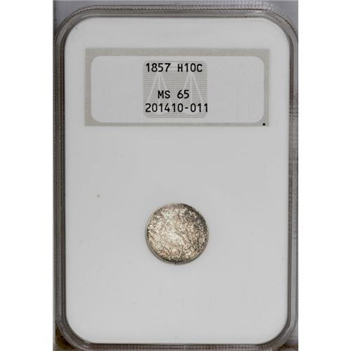 <B>1857<H10C> MS65 NGC.</B></I> Dappled golden-brown and forest-green patination is most prominent near the borders. A sharply struck and shimmering Gem, housed in a prior generation holder. <BR><BR><B>Important notice:</B> Heritage usually auctions material at the rate of 200-250 lots per hour. On some occasions eBay Live bid software or the Internet may not be able to keep up with the pace of the auction. We recommend placing a realistic absentee bid now as insurance to avoid disappointment. Occasionally the auctioneer may eliminate or reject an eBay Live bid, and the auctioneer may also reopen a lot after the close of the eBay live bidding (usually because we missed an audience bid), and may reject your bid even if it shows you as the winning bidder. By bidding via eBay Live, you agree that Heritage may award the lot to another bidder at its sole discretion under the circumstances described above or any other reasonable circumstances. Since eBay bids are not shown to us until we open the lot on the floor, we treat those bids just like floor bids. In most cases the floor responds before the eBay bid is presented to us, due to Internet lag time, so for consistency we have made it a policy that floor bids are always considered first over tie eBay live bids. Also please note that all Heritage lots purchased through eBay Live carry a 20% Buyer's Premium. Please make sure you read the Terms and Conditions before you bid. This lot is being auctioned in conjunction with a live floor auction by Heritage Galleries & Auctioneers. All final auction and invoice information will be supplied by Heritage Galleries & Auctioneers, and all other information should be considered preliminary. Lot:1893 <BR><BR><B>Winning Notification and Billing:</B> After the FINAL session in this auction is complete, Heritage will send e-mail and snail mail invoices. This process normally takes several days. All final auction and invoice information will be supplied by Heritage Galleries & Auctioneers, and all other information should be considered preliminary. <BR><BR>This auction will be conducted on a live auction floor and over the Internet through eBay Live. If you choose to place an absentee bid, please take a moment to <font color='#0000ff'><u><a href='http://pages.ebay.com/liveauctions/help/before/laabsentee.html'>learn how eBay Live absentee bidding works</a></u></font><font color='#000000'>