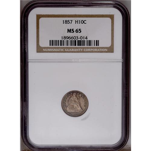 <B>1857 H10C MS65 NGC.</B></I> While this date is considered to be quite common, there is not a single Stars Obverse half dime of any date that can be considered common in Gem quality. Frosty luster with a pleasant mixture of peach-rose and sea-green color over each side. Census: 86 in 65, 42 finer (1/06).