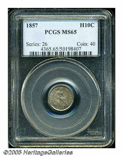 <B>1857<H10C> MS65 PCGS.</B></I> Exquisite plum, olive, and gold colors blend throughout this lustrous and unmarked Gem. The denticles are softly impressed, however, the major devices are crisp. A beautiful example of the Stars Obverse type. Population: 45 in 65, 13 finer (4/05).
