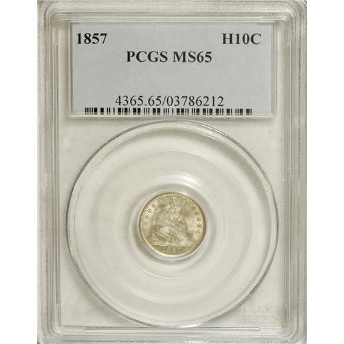 <B>1857 H10C MS65 PCGS.</B></I> This well struck Gem has pillowy luster and delicate olive, gold, and turquoise accents. With the second-highest mintage across all half dime issues, the 1857 is a logical candidate for type collectors. Population: 55 in 65, 17 finer (4/07).<BR><I>From The Palakika Collection.</B></I><BR><BR><b>Shipping:</b> Coins & Currency (<a target="_blank" href="http://www.heritageauctions.com/common/shipping.php">view shipping information</a>)