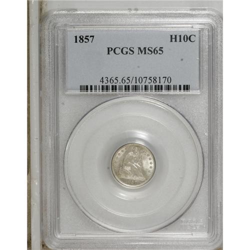 <B>1857 H10C MS65 PCGS.</B></I> This intricately struck cream-gray Gem has satin luster and exceptionally smooth surfaces. Despite a plentiful mintage, the date is scarce at the MS65 level. Population: 55 in 65, 17 finer (2/07).<BR><BR><b>Shipping:</b> Coins & Currency (<a target="_blank" href="http://www.heritageauctions.com/common/shipping.php">view shipping information</a>)