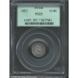 <TR><TD width="100%"><TABLE cellSpacing=1 cellPadding=3 width="100%" border=0><TBODY><TR><TD width="100%" bgColor=#79735c><FONT face=arial color=#ffffff size=3><B>Description</B> </FONT></TD></TR><TR><TD width="100%" bgColor=#ffffff><FONT face=arial size=2><B>1857 H10C MS65 PCGS.</B></I> Hints of gold color emerge from the dominate pastel lavender patina. The wreath bow is not fully struck, but the devices are generally bold. A well preserved and satiny Gem. Struck from clashed dies. Population: 40 in 65, 8 finer (4/03). </FONT></TD></TR></TBODY></TABLE></TD></TR></TBODY></TABLE><BR><A name=PricesRealized></A><TABLE cellSpacing=0 cellPadding=0 width="100%" bgColor=#000000 border=0><TBODY><TR><TD width="100%"><TABLE cellSpacing=1 cellPadding=3 width="100%" border=0><TBODY><TR><TD width="100%" bgColor=#79735c><A name=PR><FONT face=arial color=#ffffff size=3><B>Previous Prices from Heritage Auctions</B> </FONT></A></TD></TR><TR><TD bgColor=#f6f6ed><TABLE cellSpacing=0 cellPadding=0 width="100%" border=1><TBODY><TR><TD align=middle width="33%"><B>Date</B></TD><TD align=middle width="33%"><B>Service</B></TD><TD align=middle width="33%"><B>Price</B></TD></TR><TR bgColor=whitesmoke><TD width="33%"><B>04/05/2001</B></TD><TD width="33%">NGC</TD><TD width="33%">$632.50</TD></TR><TR bgColor=whitesmoke><TD width="33%"><B>01/11/2000</B></TD><TD width="33%">NGC</TD><TD width="33%">$1,100.00</TD></TR><TR bgColor=whitesmoke><TD width="33%"><B>04/24/1998</B></TD><TD width="33%">NGC</TD><TD width="33%">$522.50</TD></TR><TR bgColor=whitesmoke><TD width="33%"><B>07/30/1994</B></TD><TD width="33%">NGC</TD><TD width="33%">$687.50</TD></TR><TR bgColor=whitesmoke><TD width="33%"><B>02/02/1994</B></TD><TD width="33%">NGC</TD><TD width="33%">$577.50</TD></TR><TR bgColor=whitesmoke><TD width="33%"><B>06/02/1995</B></TD><TD width="33%">NGC</TD><TD width="33%">$660.00</TD></TR><TR bgColor=whitesmoke><TD width="33%"><B>09/22/1999</B></TD><TD width="33%">NGC</TD><TD width="33%">$825.00</TD></TR><TR bgColor=whitesmoke><TD width="33%"><B>03/22/1997</B></TD><TD width="33%">NGC</TD><TD width="33%">$575.00</TD></TR><TR bgColor=whitesmoke><TD width="33%"><B>02/24/1995</B></TD><TD width="33%">NGC</TD><TD width="33%">$638.00</TD></TR><TR bgColor=whitesmoke><TD width="33%"><B>01/04/1995</B></TD><TD width="33%">NGC</TD><TD width="33%">$880.00</TD></TR><TR bgColor=whitesmoke><TD width="33%"><B>03/16/1996</B></TD><TD width="33%">NGC</TD><TD width="33%">$495.00</TD></TR><TR bgColor=whitesmoke><TD width="33%"><B>08/13/1999</B></TD><TD width="33%">NGC</TD><TD width="33%">$690.00</TD></TR><TR bgColor=whitesmoke><TD width="33%"><B>03/16/1996</B></TD><TD width="33%">NGC</TD><TD width="33%">$660.00</TD></TR><TR bgColor=whitesmoke><TD width="33%"><B>10/01/1995</B></TD><TD width="33%">NGC</TD><TD width="33%">$770.00</TD></TR><TR bgColor=whitesmoke><TD width="33%"><B>11/01/1996</B></TD><TD width="33%">NGC</TD><TD width="33%">$660.00</TD></TR><TR bgColor=whitesmoke><TD width="33%"><B>09/01/1997</B></TD><TD width="33%">NGC</TD><TD width="33%">$825.00</TD></TR><TR bgColor=whitesmoke><TD width="33%"><B>03/01/1998</B></TD><TD width="33%">NGC</TD><TD width="33%">$660.00</TD></TR><TR bgColor=whitesmoke><TD width="33%"><B>01/14/2003</B></TD><TD width="33%">PCGS</TD><TD width="33%">$1,092.50</TD></TR><TR bgColor=whitesmoke><TD width="33%"><B>02/11/2000</B></TD><TD width="33%">PCGS</TD><TD width="33%">$1,006.25</TD></TR><TR bgColor=whitesmoke><TD width="33%"><B>08/01/2000</B></TD><TD width="33%">PCGS</TD><TD width="33%">$850.00</TD></TR><TR bgColor=whitesmoke><TD width="33%"><B>03/01/1998</B></TD><TD width="33%">PCGS</TD><TD width="33%">$605.00</TD></TR><TR bgColor=whitesmoke><TD width="33%"><B>01/29/2002</B></TD><TD width="33%">NGC</TD><TD width="33%">$833.75</TD></TR><TR bgColor=whitesmoke><TD width="33%"><B>11/17/2001</B></TD><TD width="33%">NGC</TD><TD width="33%">$494.50</TD></TR><TR bgColor=whitesmoke><TD width="33%"><B>08/08/2001</B></TD><TD width="33%">NGC</TD><TD width="33%">$575.00</TD></TR><TR bgColor=whitesmoke><TD width="33%"><B>05/31/2003</B></TD><TD width="33%">NGC</TD><TD width="33%">$805.00</TD></TR><TR bgColor=whitesmoke><TD width="33%"><B>03/01/1997</B></TD><TD width="33%">ANACS</TD><TD width="33%">$1,210.00</TD></TR></TBODY></TABLE></TD></TR><TR><TD bgColor=#ffffff><FONT face=arial size=1 ?>PLEASE NOTE: All prices realized reflect the final hammer price PLUS the buyer's premium in auctions that charge a buyer's premium. Each item has a notation at the top of the listing indicating whether that lot included a buyer's premium. Example: A item that sells with a final hammer price of $100 and a 20% buyer's premium will display with a price realized of $120. All information listed is intended to be as accurate as possible, but errors are possible. Please use this guide carefully and inform us of any inaccuracies. </FONT></TD></TR></TBODY></TABLE></TD></TR></TBODY></TABLE><BR><TABLE cellSpacing=0 cellPadding=0 width="100%" bgColor=#000000 border=0><TBODY><TR><TD width="100%"><TABLE cellSpacing=1 cellPadding=3 width="100%" border=0><TBODY><TR><TD width="100%" bgColor=#79735c colSpan=6><FONT face=arial color=#ffffff size=3><B>Price Guide*</B> </FONT></TD></TR><TR bgColor=#f6f6ed><TD align=middle><B>Grade</B> </TD><TD align=middle><B>Coin World<BR>(Trends)</B> </TD><TD align=middle><B>Numismedia<BR>Retail</B> </TD><TD align=middle><B>Numismedia<BR>Wholesale</B> </TD><TD align=middle><B>Coin<BR>Universe</B> </TD><TD align=middle><B>Heritage<BR>Value Index</B> </TD></TR><TR bgColor=#ffffff><TD align=middle>64</TD><TD align=right>$475.00</TD><TD align=right>$760.00</TD><TD align=right>$610.00</TD><TD align=right>$610.00</TD><TD align=right>$369.25</TD></TR><TR style="FONT-WEIGHT: bold" bgColor=#cccfdd><TD align=middle>65</TD><TD align=right>$975.00</TD><TD align=right>---</TD><TD align=right>$850.00</TD><TD align=right>$1,250.00</TD><TD align=right>$880.00</TD></TR><TR bgColor=#ffffff><TD align=middle>66</TD><TD align=right>---</TD><TD align