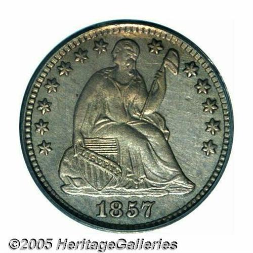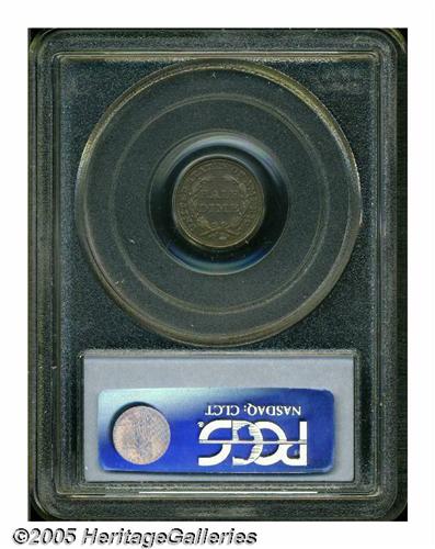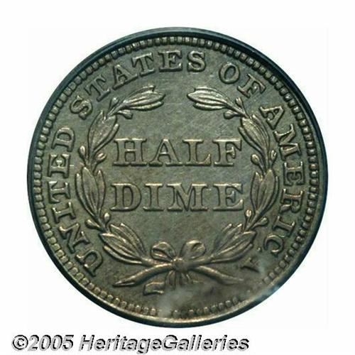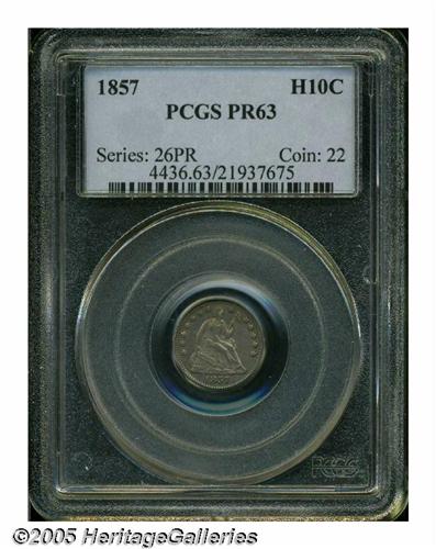 <B>1857<H10C> PR63 PCGS.</B></I> The actual numbers of proof 1857 Half Dimes are not known today, so we are left to speculate about the number of surviving specimens based on the frequency of appearance, estimates of experts, and the population data. It appears that the 1857 Half Dime was one of the more populous proof issues struck just before the advent of commercial proof production in 1858. Some ten or more years ago, Al Blythe estimated that perhaps only 16-20 pieces might exist. However, we think probably twice that many actually be extant today based on the population data from NGC and PCGS. This is a deeply toned coin whose surfaces display cobalt-blue and antique-golden toning with considerable reflectivity from the fields evident through the rich, multi-layered patination. A few scattered hairlines are visible in the fields, thus accounting for the PR63 grade.