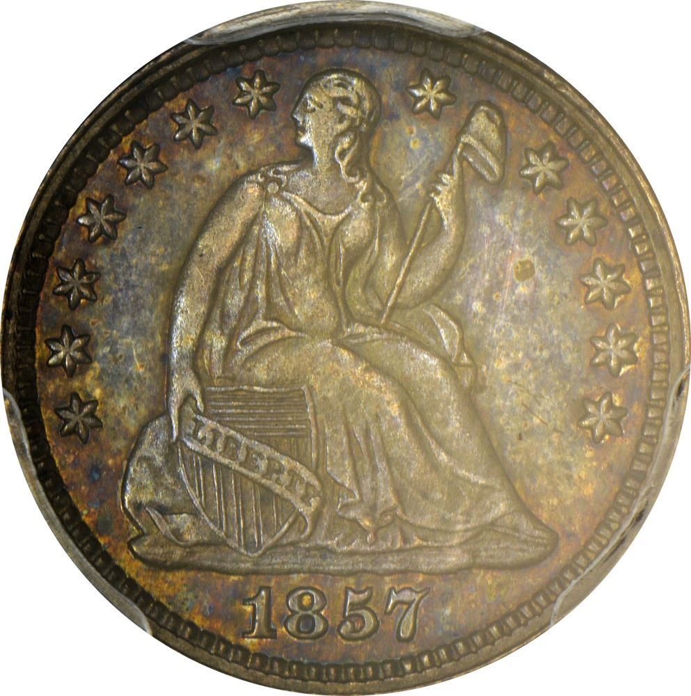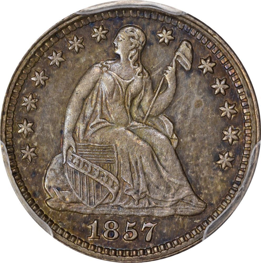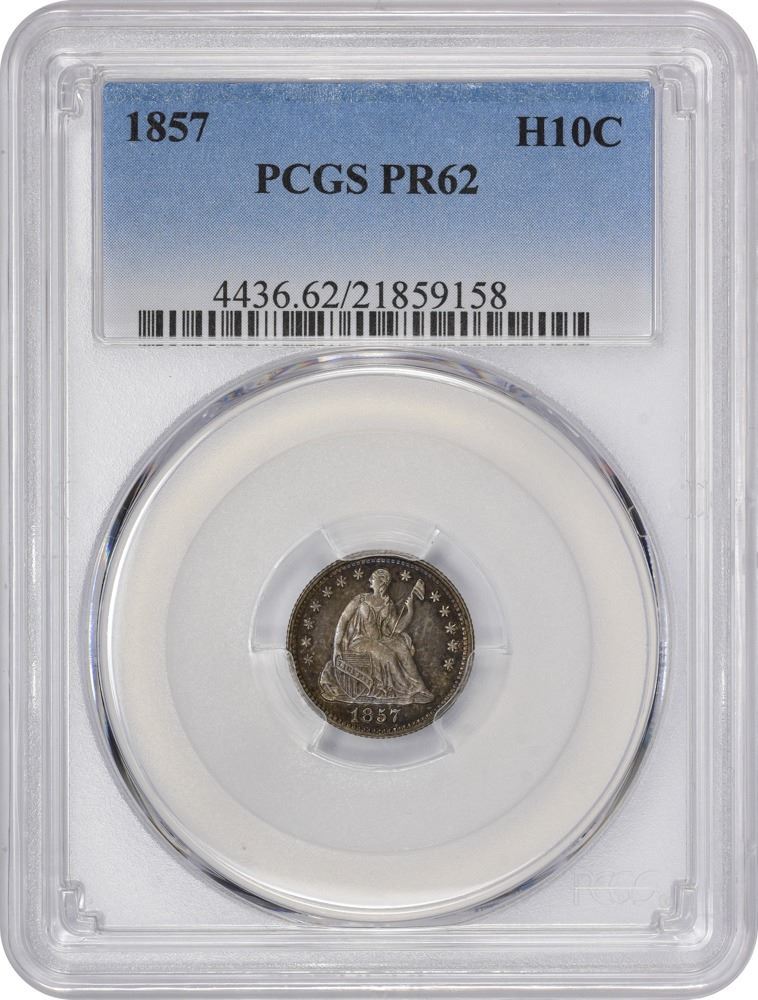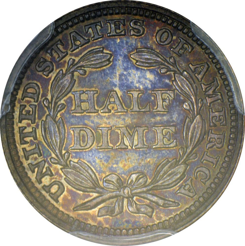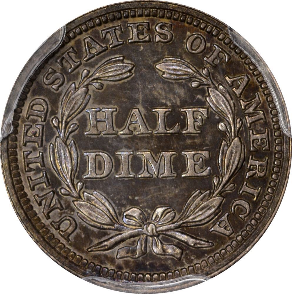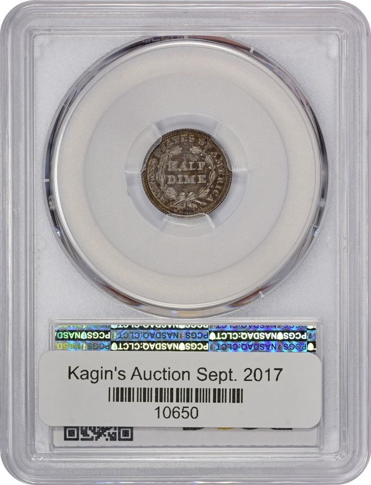 The lustrous surfaces offer varied shades of steel gray with some peripheral highlights of rainbow iridescence at the rims. From a modest mintage for the date that was no doubt minted by the dozens, though probably not by the hundreds; PCGS suggests “50 to 75” Proofs of the date exist. A great first step for a collector stepping into the Proof half dime discipline, or to add some flair to an advanced type set.