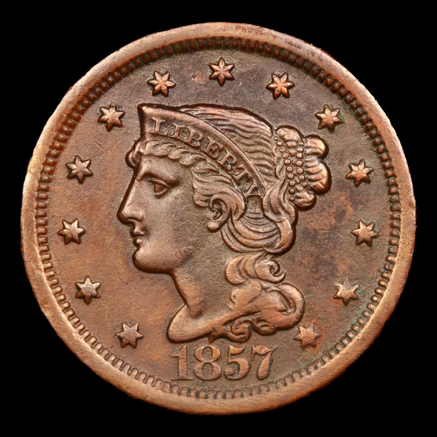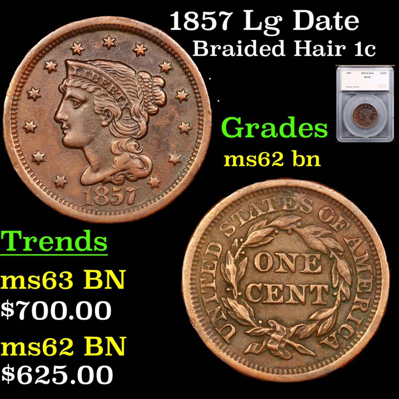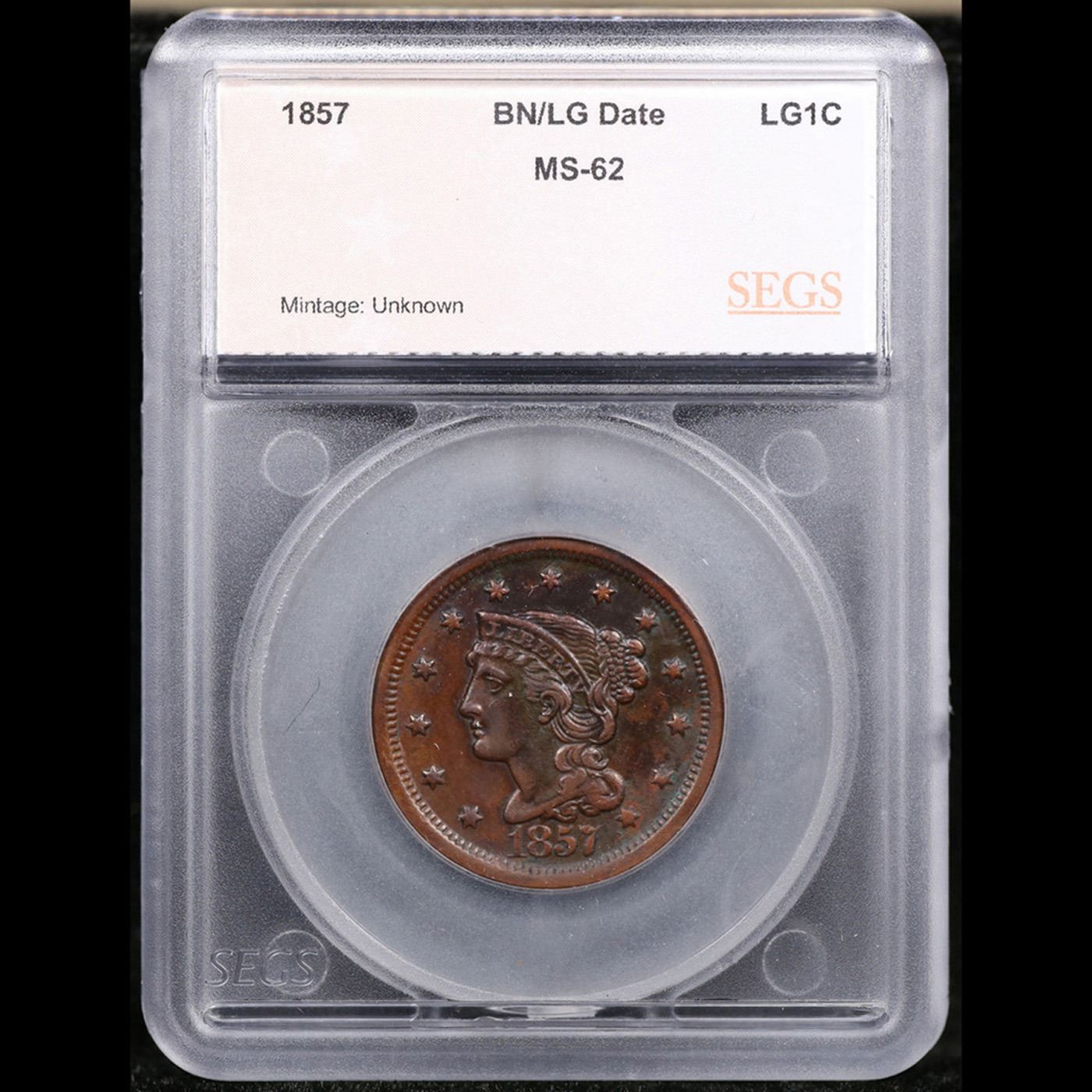 1857 Lg Date Braided Hair Large Cent 1c Graded ms62 bn By SEGS. A Corey's Pick, Bid to Win Coin