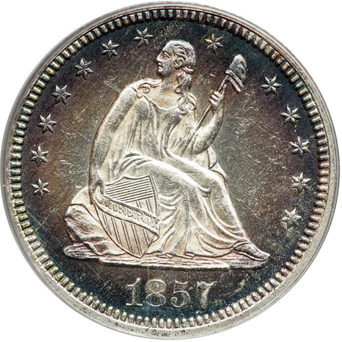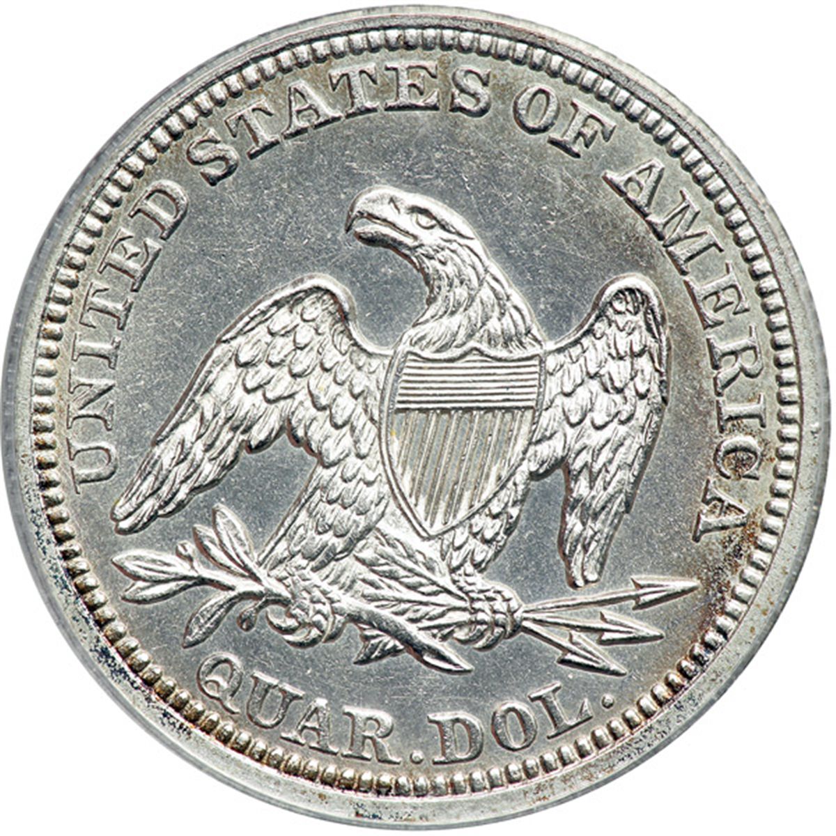 1857 Liberty Seated Quarter Dollar. PCGS Genuine. Our grade is MS-60 with light hairlines (PCGS # 5442) .