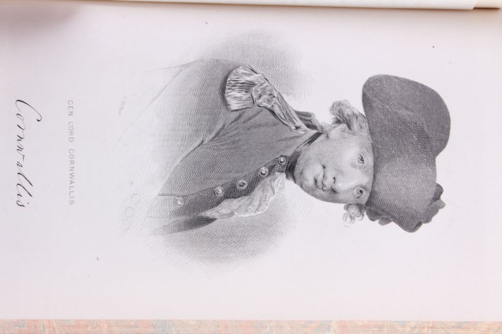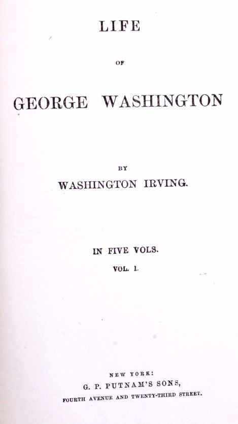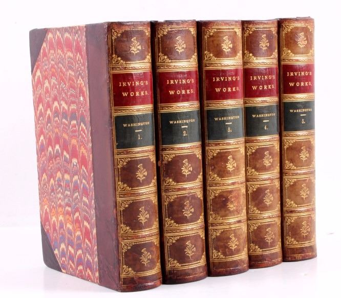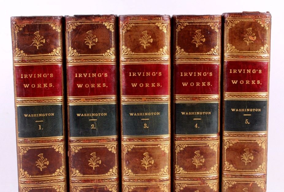 This is an 1857 publication of "Life of George Washington" by Washington Irving. This lot includes volumes 1-5. Each volume is bound in leather with marbled cover and stamped gilt spine. The books provide a comprehensive biography of the first President of the United States. They are all in good condition with minor shelf wear. Each book measures 5.25" x 7.25".